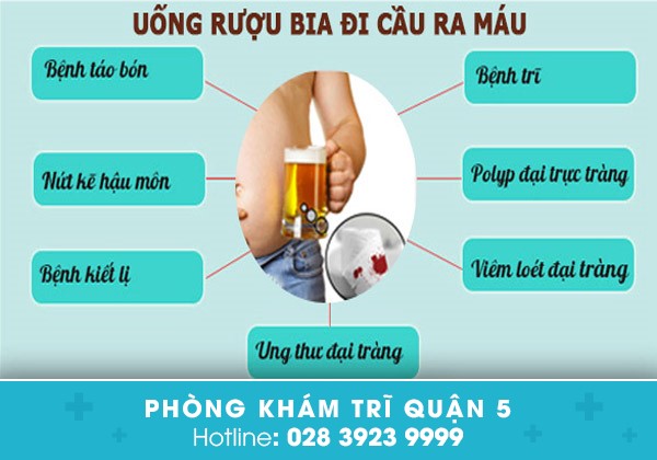 Rượu, bia chính là một trong những tác nhân hàng đầu gây kích thích lên hệ thống tiêu hóa làm tổn thương một hay nhiều bộ phận trong hệ thống này gây ra hiện tượng đi cầu ra máu, gia tăng tỉ lệ mắc các bệnh hậu môn - trực tràng.